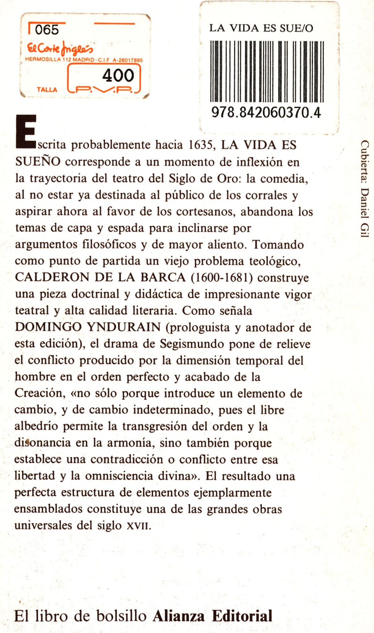 La vida es sueño / Calderón de la Barca ; introducción y notas de Domingo Ynduráin. -- Madrid: Alianza Editorial, [1989]. -- Artes Gráficas Ibarra. -- ©1989. -- 147 stran ; 18 cm. -- (El Libro de bolsillo. Sección Literatura (Alianza Editorial)) (El Libro de Bolsillo ; 1370). -- Zdobená obálka. Úvod. - Poznámky. - Na zadní straně obálky doprovodný text. -- Obsahuje bibliografii. -- ISBN : 84-206-0370-8 (brožováno).