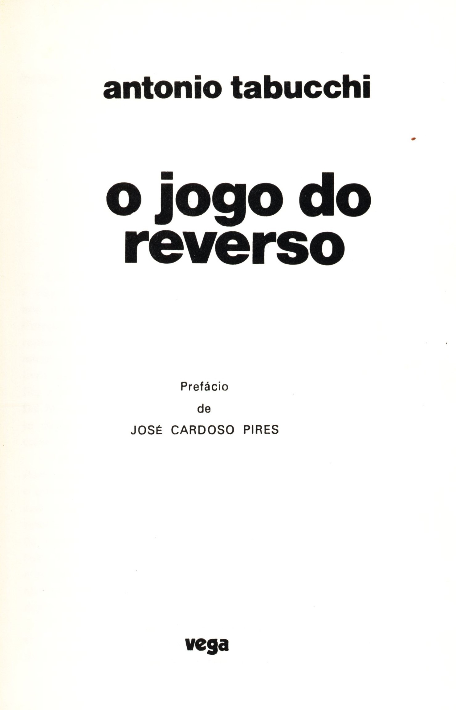 Title information O jogo do reverso / Antonio Tabucchi ; prefácio de José Cardoso Pires Personal name Tabucchi, Antonio (Author) Další autoři Pires, José Cardoso, 1925-1998 (win) Corporation Vega (Publisher) Edition statement 1.a edição Publication [Lisboa] : Vega, [1984] Scope 130 stran : čb ilustrace ; 21 cm ISBN (Brožováno) Edition Provisórios & Definitivos (Vega)