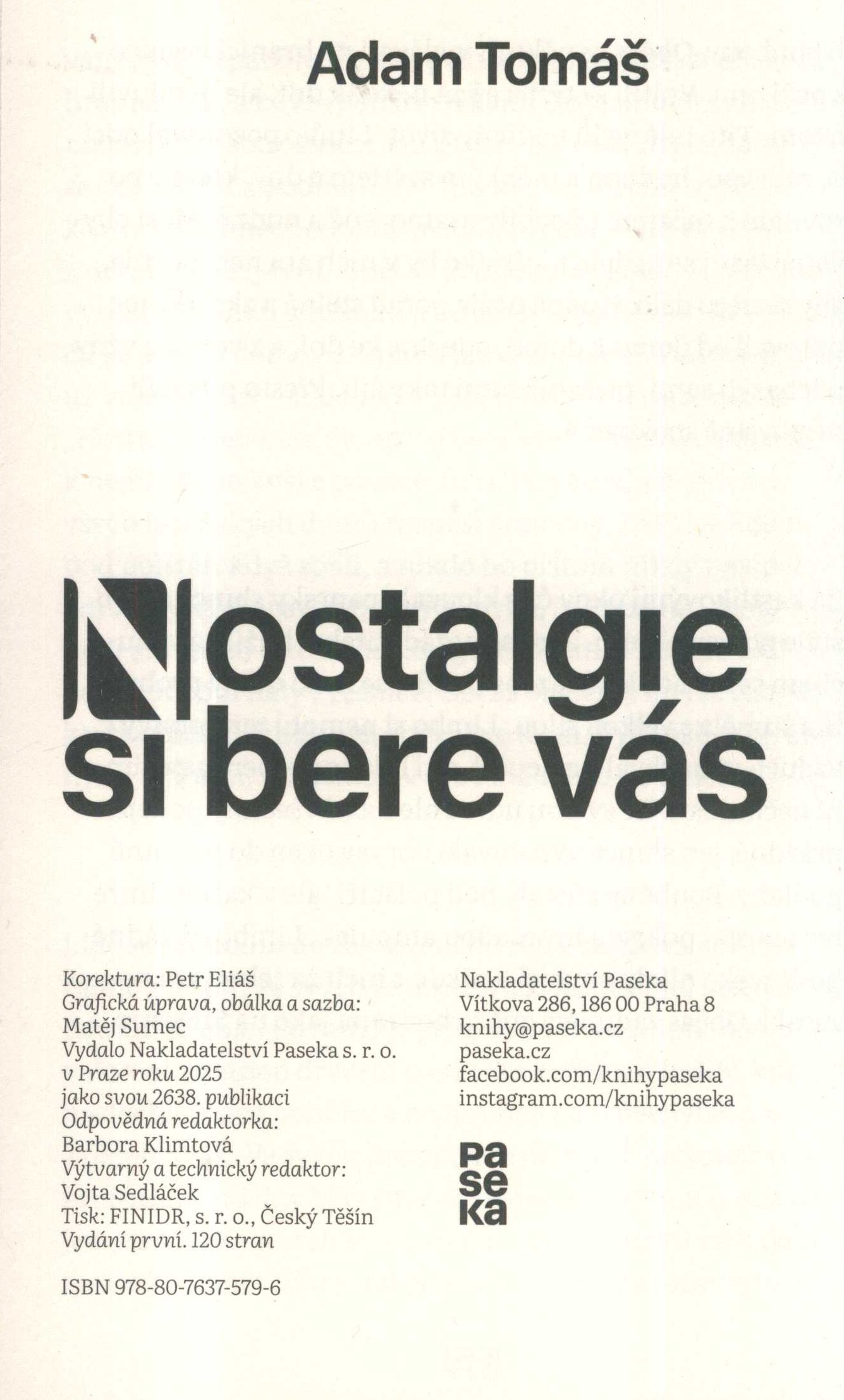 Title information Nostalgie si bere vás / Adam Tomáš ; grafická úprava, obálka a sazba Matěj Sumec Personal name Tomáš, Adam, 1991- (Author) Další autoři Sumec, Matěj, 2000- (Book designer) (Bookjacket designer) (Compositor) Corporation Nakladatelství Paseka (Publisher) Finidr (tiskárna) (Printer) Edition statement Vydání první Publication V Praze : Paseka, 2025 Manufacture Český Těšín : Finidr, s.r.o. Scope 119 stran ; 20 cm ISBN 978-80-7637-579-6 (brožováno) Country Czech Republic Language Czech Note Zdobená barevná obálka. - Text na přední záložce obálky, na zadní záložce poznámka o autorovi s fotem. - Obsah. - Na zadní straně obálky anotace knihy.
