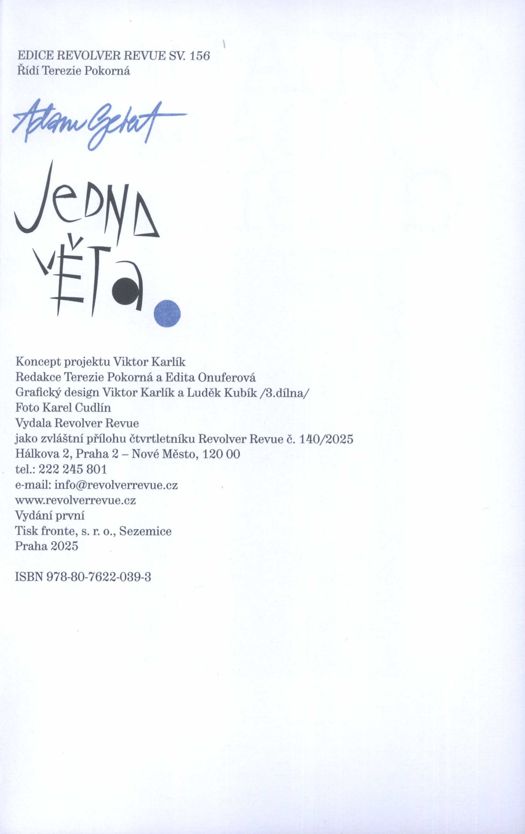 1. Title informationJedna věta / Adam Gebert ; grafický design Viktor Karlík a Luděk Kubík ; foto Karel Cudlín
